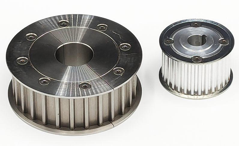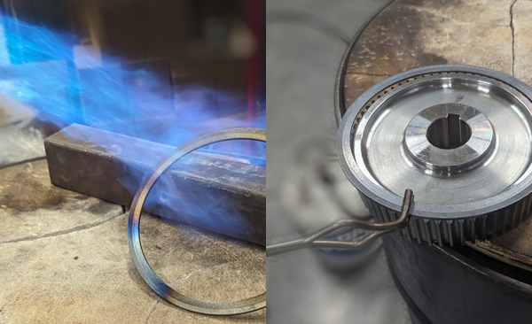 Heat shrinking is an exceptional way of attaching heavy, large-diameter flanges to timing pulleys. The flanges are heated to 450 degrees Fahrenheit or more and then placed onto the pulleys’ flange step, which is 0.015” to 0.020” larger in diameter than the ID of the flange in its cold state. Upon cooling, the flange shrinks onto the flange step of the pulley, permanently holding it in place.