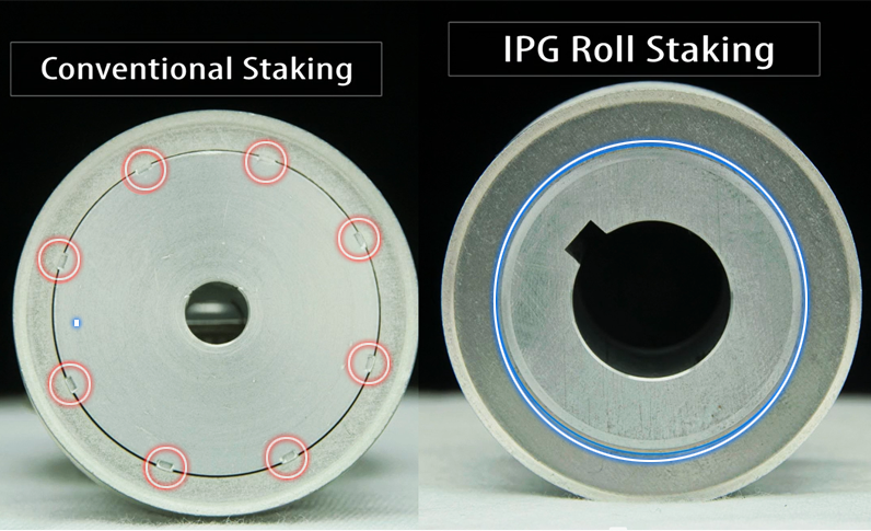 Roll staking is an excellent way of attaching flanges to smaller timing pulleys. Roll staking produces a crimp 100% of the way around the edge of the flange, rather than on 6 to 8 points. This method is superior to conventional staking methods that only hold a small percentage of the flange to the pulley.